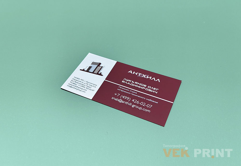 Ответ: Soft Touch предлагает иной, более эксклюзивный эффект. Глянец блестит и выглядит ярко, а Soft Touch — матовый, мягкий и тактильно приятный. Он не пачкает руки и более устойчив к отпечаткам пальцев по сравнению с глянцем. Это выбор для тех, кто хочет подчеркнуть стиль и статус, а не просто сделать визитку блестящей.